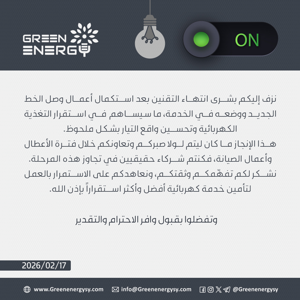 نشكر لكم تفهّمكم وثقتكم، ونعاهدكم على الاستمرار بالعمل لتأمين خدمة كهربائية أفضل وأكثر استقراراً بإذن الله.
