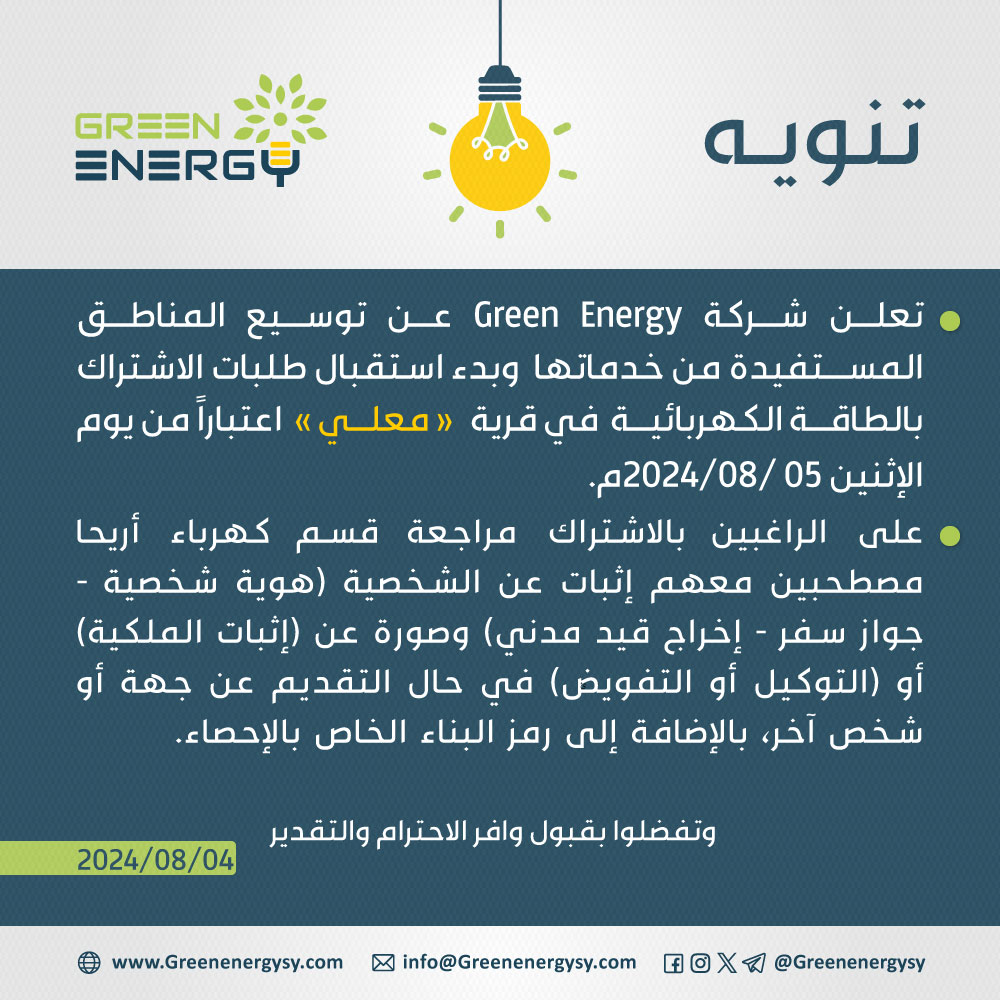 تعلن شركة Green Energy عن توسيع المناطق المستفيدة من خدماتها وبدء استقبال طلبات الاشتراك بالطاقة الكهربائية في قرية معلي اعتباراً من يوم
