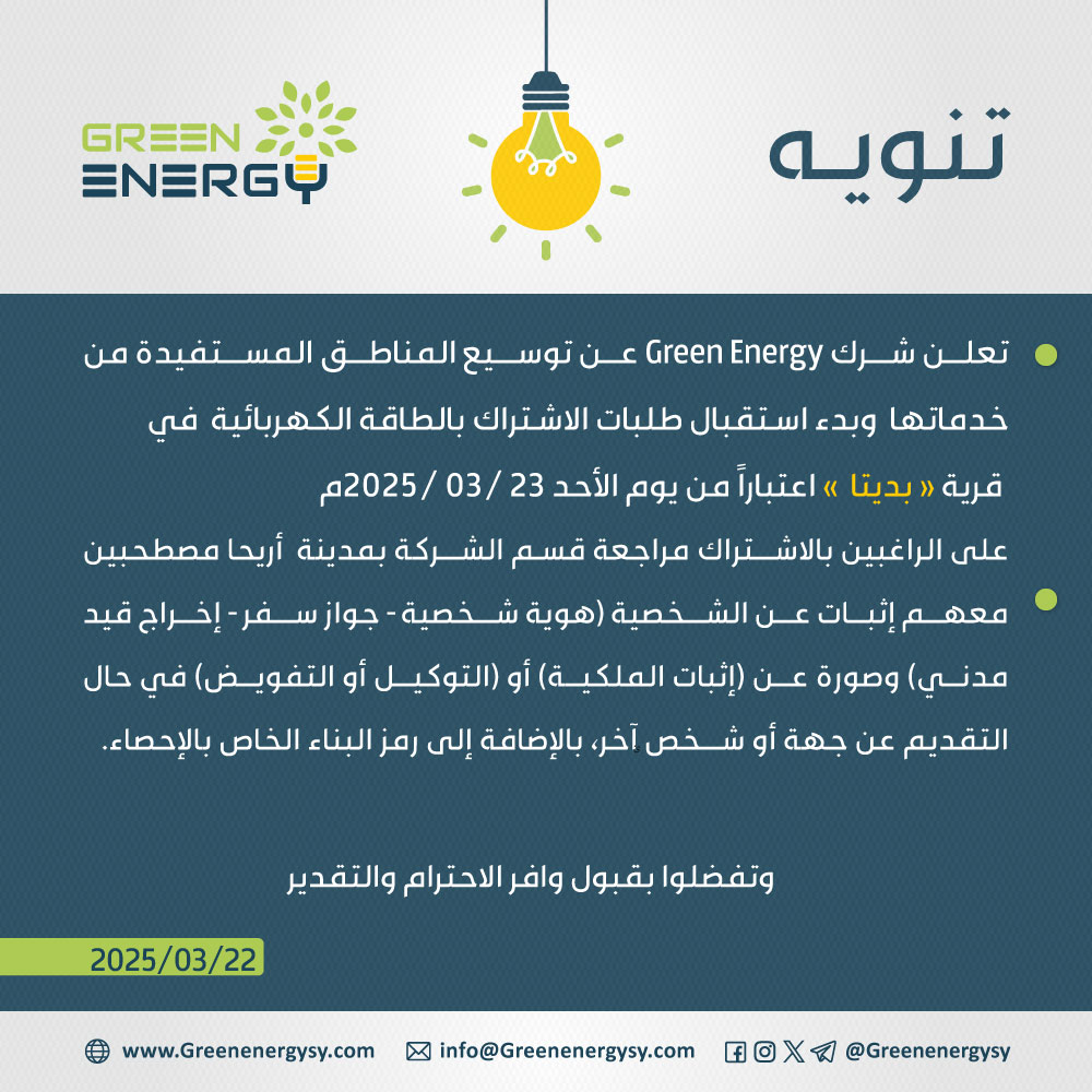 تعلن شركة Green Energy عن توسيع المناطق المستفيدة من خدماتها وبدء استقبال طلبات الاشتراك بالطاقة الكهربائية في قرية #بديتا لتابعة لفرع #إدلب اعتباراً من يوم