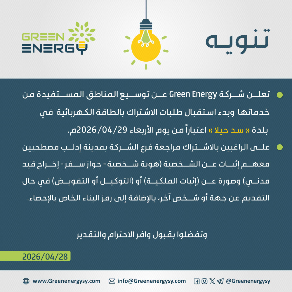 تعلن شركة الكهرباء Green Energy عن بدء استقبال طلبات الاشتراك بالطاقة الكهربائية في بلدة سد حيلا التابعة لفرع إدلب اعتباراً من يوم