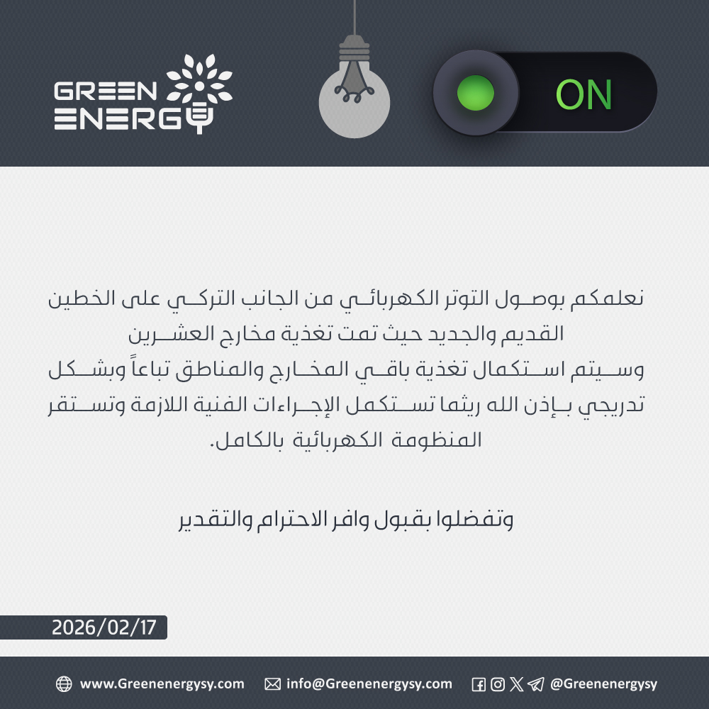 نعلمكم بوصول التوتر الكهربائي من الجانب التركي على الخطين القديم والجديد حيث تمت تغذية مخارج العشرين