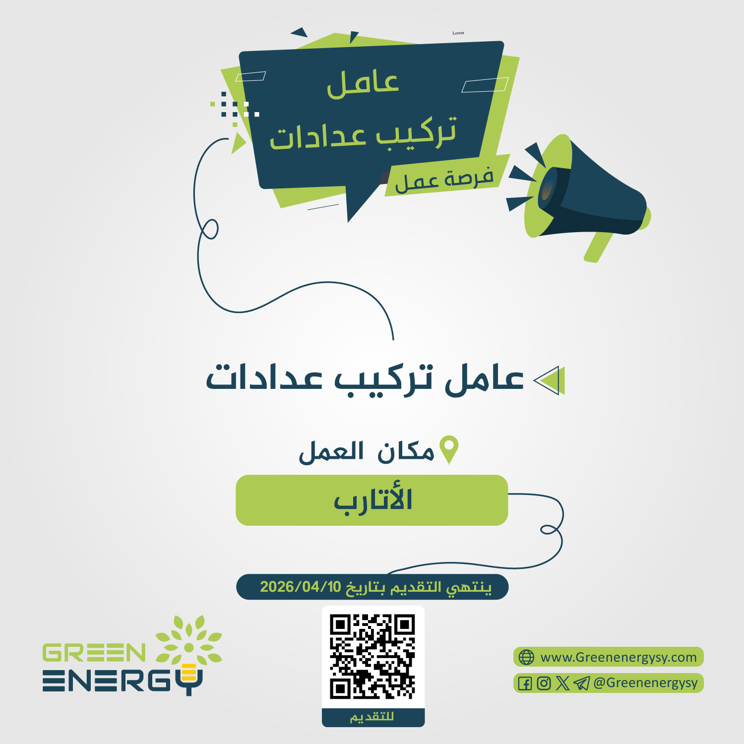 تعلن شركة Green Energy عن وجود شاغر وظيفي بصفة “عامل تركيب عدادات ” في قسم #الأتارب. 💡💡